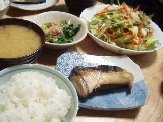 まぐろの頭の煮つけ、ほうれんそうおひたし、味噌汁。