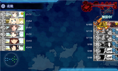 本体編成と基地航空隊で制空値 660 の計算なんですが、制空拮抗のときが多かったです。まだ制空値が足りないのか。制空権は優勢または確保しないと空母のカットインが発動しないし、夜戦のときに夜偵が発動しない(ただ夜偵は制空拮抗以外で発動します。つまり劣勢でも発動する)ので、制空は取りに行きましょう。